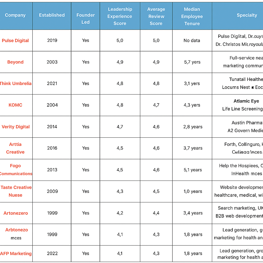 Six of eight top agencies maintain founder leadership, suggesting that original vision preservation significantly impacts healthcare content marketing effectiveness. Founder-led agencies consistently demonstrate stronger healthcare industry expertise and more personalized client relationships.