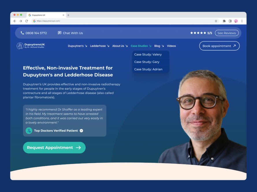 Modern homepage design for Dupuytrens UK, enhancing patient experience with seamless booking, highlighting Dr. Shaffer's expertise and media features, and driving conversions for non ...